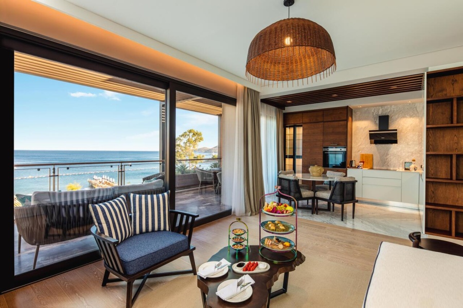 Номер уютный, со всем необходимым, чайник, капсульная кофемашина, бесплатная вода в номере в огромном количестве, банные принадлежности фирмы Amouage, утюг с гладильной доской.Большая красивая территория, внимательное обслуживание на пляже.